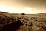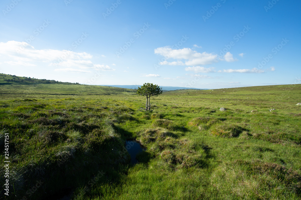un petit arbre isolé au centre d'un plateau verdoyant sur les montagnes de Lozère