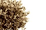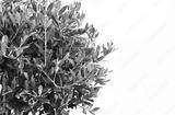 Botanical styled stock image, web banner Closeup of green olive tree leaves and branches, Olea europaea over white wall. Empty copy space for text.