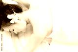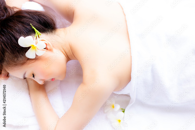 Charming beautiful woman is lying down on bed. Attractive beautiful woman is resting at spa shop. Gorgeous girl feel relaxed, happy. Attractive lady has beautiful or nice skin. She puts flower on ear
