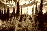 Lake on the summit of Mount Revelstoke sunset reflection sunstar across forest with blue sky and clouds. British Columbia Canada.