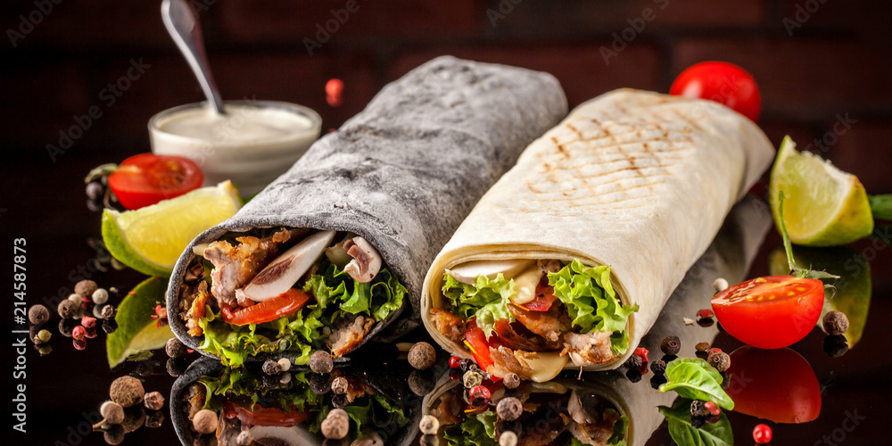 Two burrito, black and white lavash with chicken, mushrooms, salad, cherry tomatoes, lime, and salsa. Copy space, selective focus