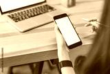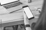 woman holding smartphone and using laptop on table in office room on windows with trees and nature background, for graphics display montage. Take your screen to put on advertising.