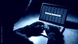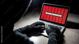 Male hacker hand on laptop computer keyboard with red binary screen of ransomware attacking. Cyber attack and Internet data security concept