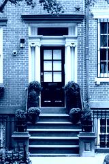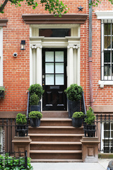 Facade black door with flowers in pots