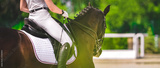 Elegant rider woman in white uniform and sorrel horse. Beautiful girl at advanced dressage test on equestrian competition. Professional female horse rider, equine theme.