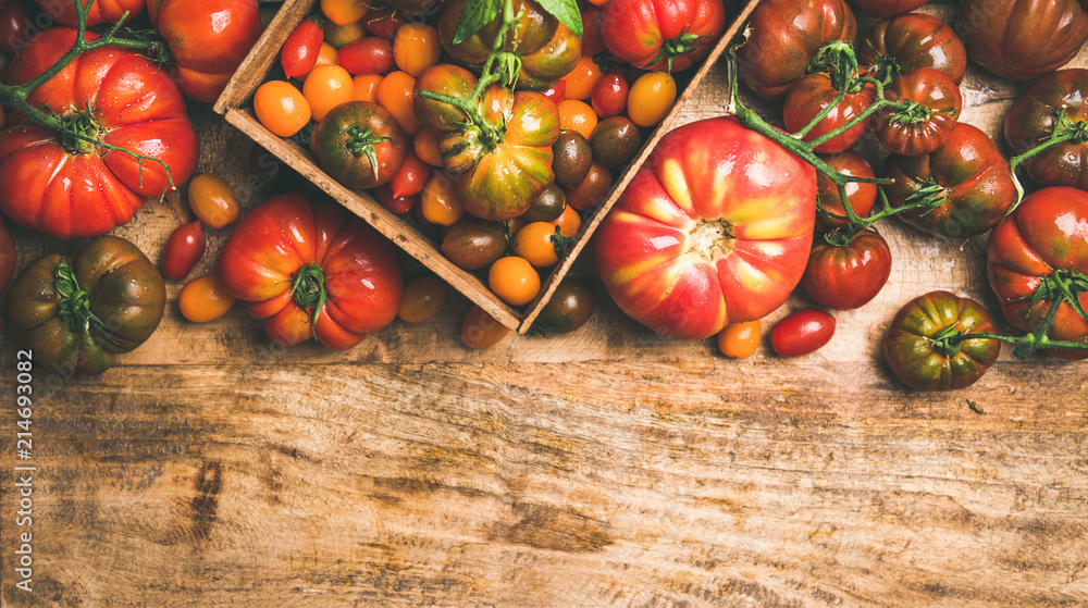 Flat-lay of fresh colorful ripe Fall or Summer heirloom, bunch and cherry tomatoes veriety over rustic wooden background, top view, copy space. Local market seasonal produce