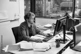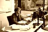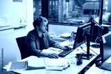Young phd student studying writing final paper for exam at university. Working man at office desk typing at desktop computer in library room.