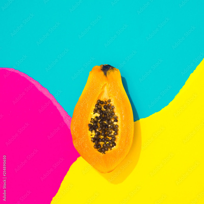 Creative tropical layout with papaya and colorful vivid papers. Abstract colors art background. Minimal summer concept. Flat lay.