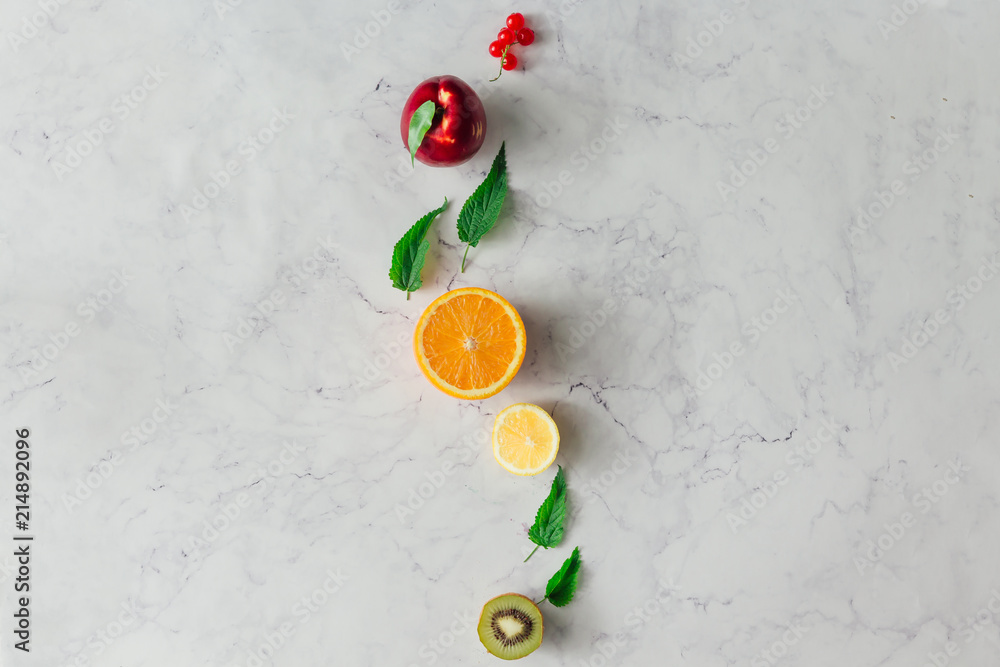 Creative food layout with fruits, vegetables and leaves on bright marble table background. Minimal healthy food concept. Flat lay.