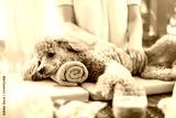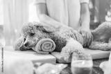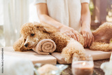 Woman giving body massage to a dog. Spa still life with aromatic candles, flowers and towel.