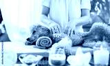 Woman giving body massage to a dog. Spa still life with aromatic candles, flowers and towel.
