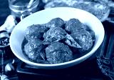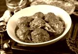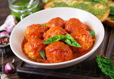 Meatballs in tomato sauce and toast with basil pesto. Dinner. Tasty food.