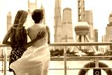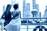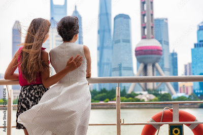 Two women taking the ferry in Shanghai city, China, crossing the Bund river looking at the view of famous pearl tv tower, landmark. Travel people lifestyle.