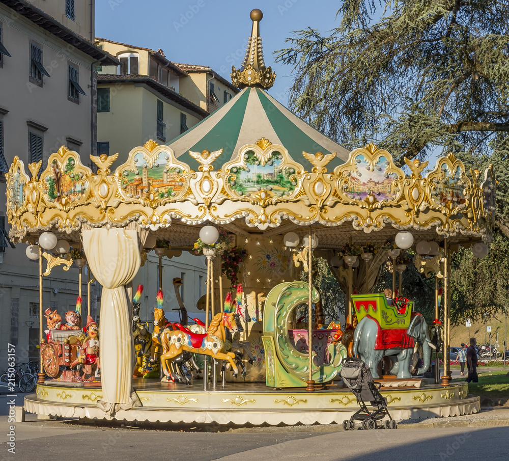 Antique children's carousel in the historic center of Lucca, Tuscany, Italy