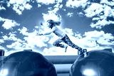 Happy little girl having lots of fun while jumping from ball to ball on an inflate castle.
