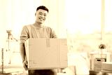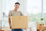 Happy cheerful ethnic male in casual clothes carrying cardboard box and looking at camera on moving day with cartons and drawing easels on blurred background
