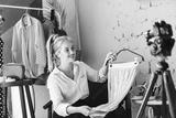 Pretty smiling fashion blogger holding skirt on hanger while happily recording new fashion video for vlog with clothes rack on background