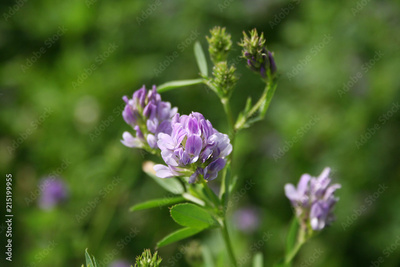 Beautiful purple alfalfa flower in the field. Medicago sativa cultivation in bloom in summer