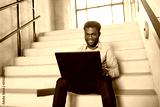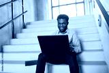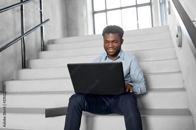 business, people and technology concept - african american businessman with laptop working computer at office stairs