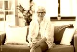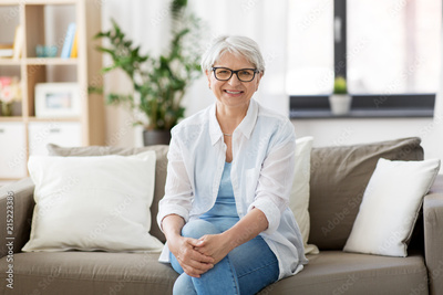 vision, age and people concept - portrait of happy senior woman in glasses sittin on sofa at home