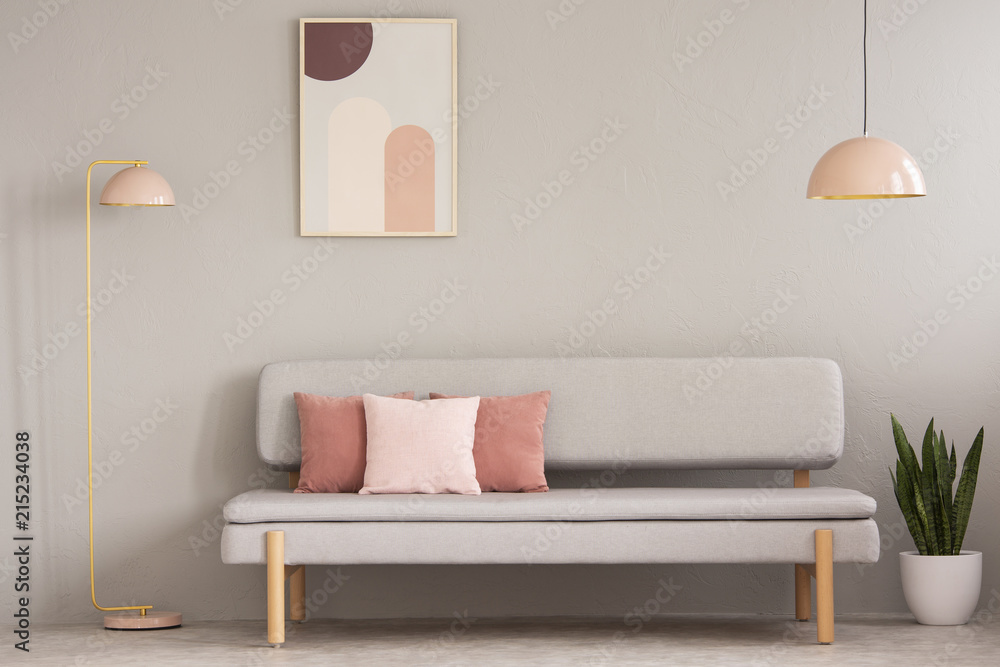 Real photo of grey sitting room interior with couch with cushions, pastel pink lamps, fresh plant and simple poster on the wall