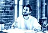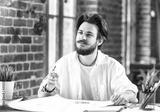 Young ambitious bearded architect in white shirt looking to the window in loft office
