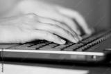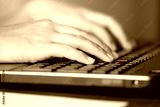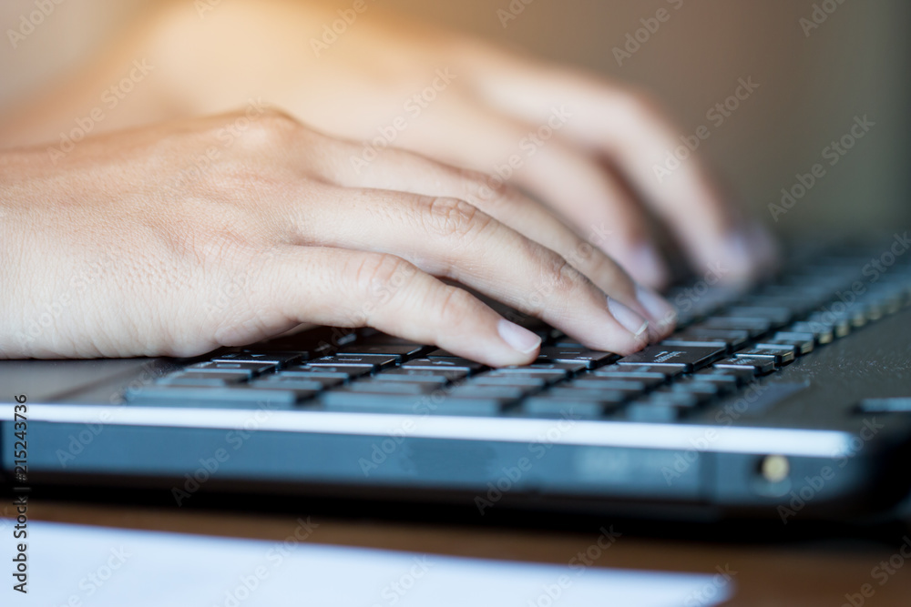 Online searching social networks by Technology Concept: Business woman using laptop computer device, hands typing text message to connect wifi for shopping online in office