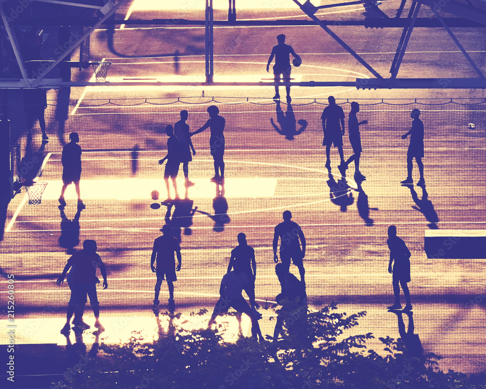 Street basketball players silhouettes at sunset, color toning applied, New York City, USA.