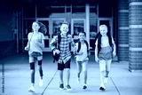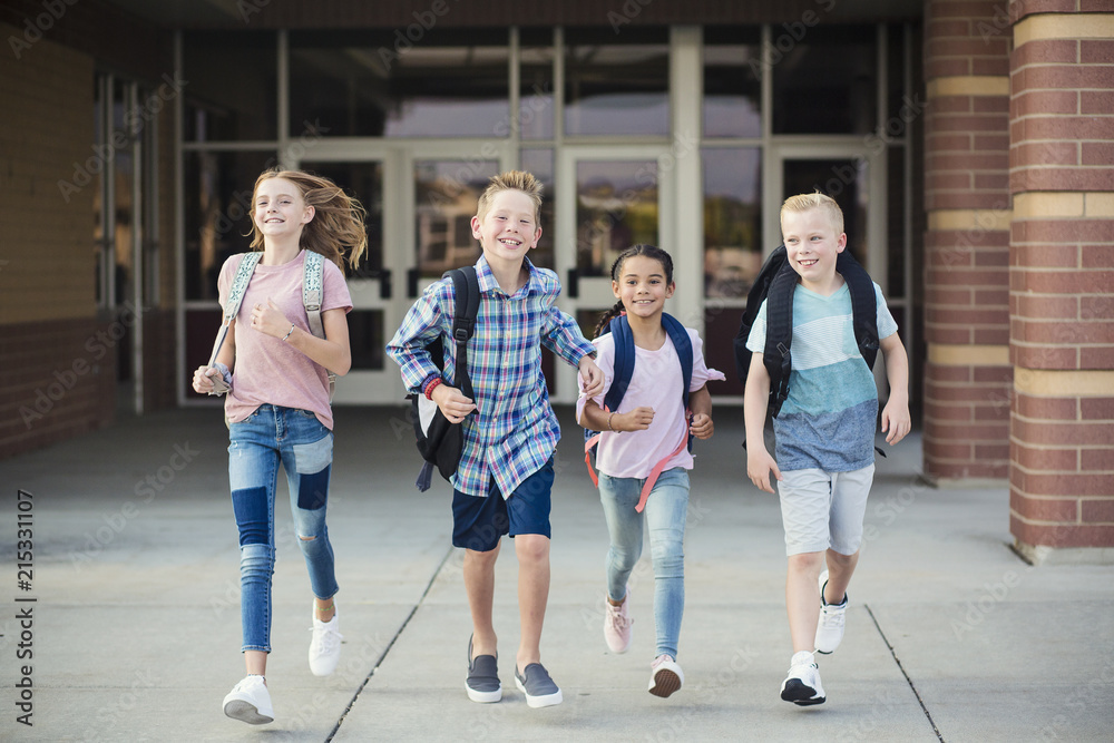 Group of school kids running as they leave elementary school at the end of day. Going home from school happy and excited. Back to school photo