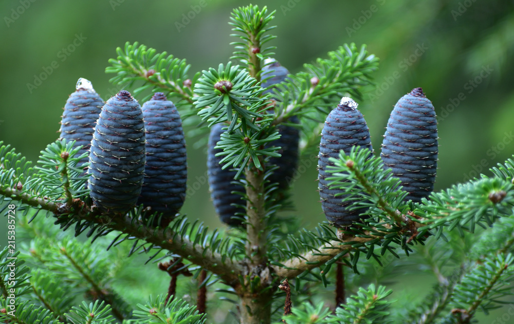 fioletowe szyszki jodły koreańskiej rosnącej w polskim lesie