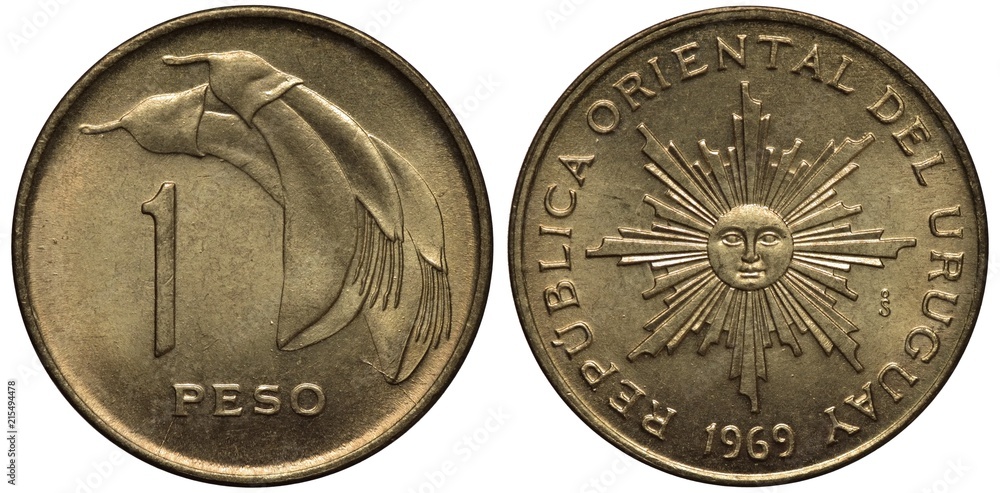 Uruguay Uruguayan coin 1 one peso 1969, value below flower, radiant sun in centre, date below,