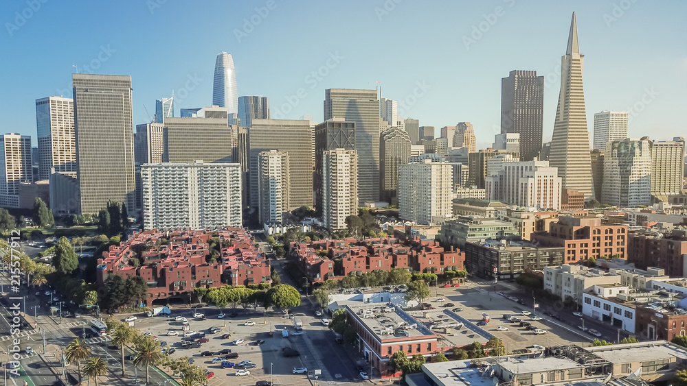 Top view San Francisco financial district and Jackson Square from Pier 33. Aerial view Bay Area city at sunset, cityscape and metropolis background