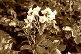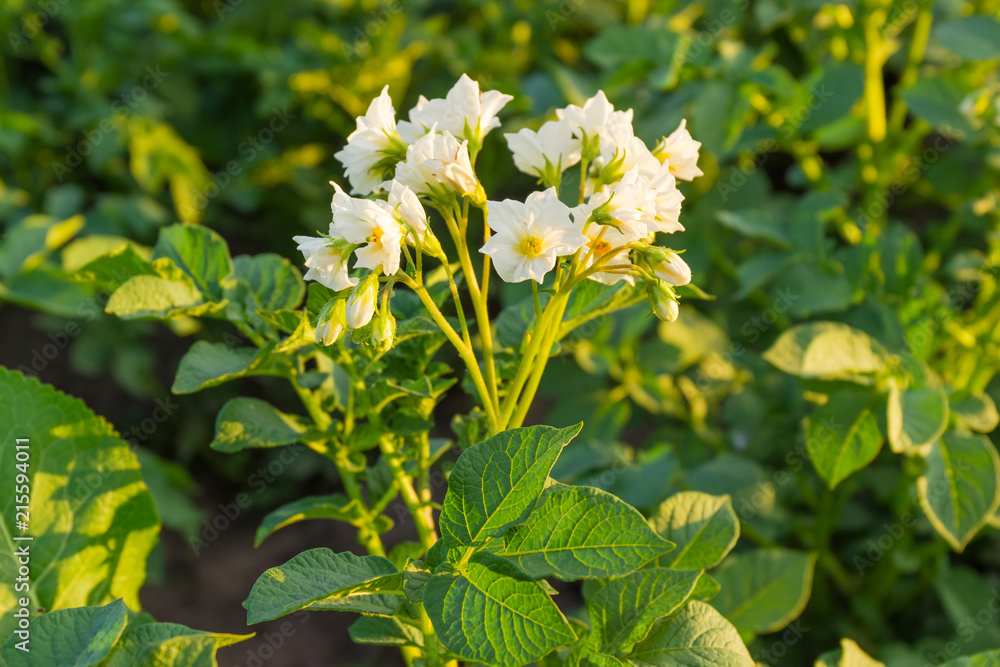 White flowers of potatoes on a plantation at sunset