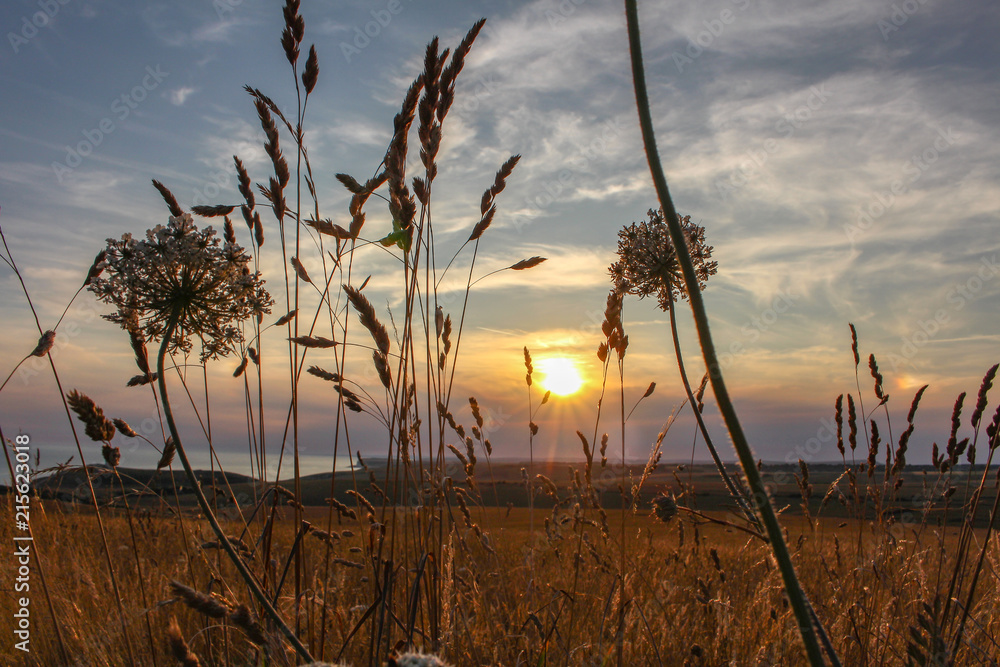 sunset at Beachy Head, with silhouetted flowers and wheat