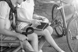 Lovely couple with bicycle sitting on beanch and using laptop in the sunny summer park