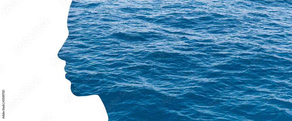 beauty, nature, travel and ecology concept - portrait of woman profile with sea water with double exposure effect