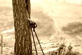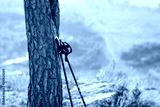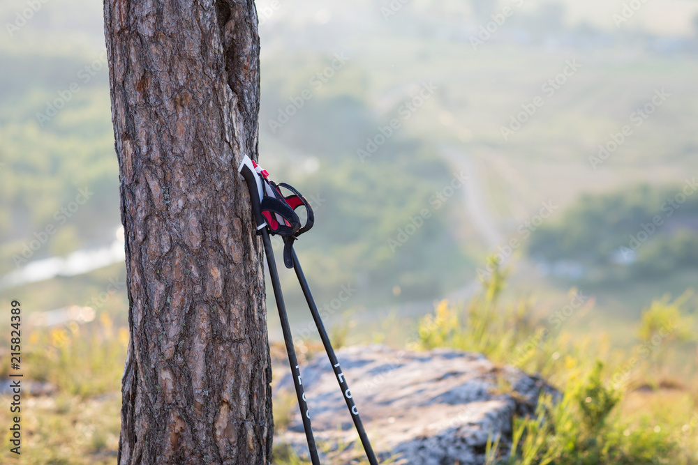 Nordic walking sticks leaning against a tree. beautiful natural landscape, open spaces. concept: travel and active lifestyle