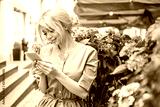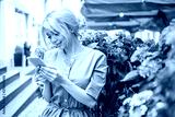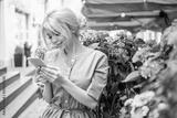 Gorgeous beautiful young woman with blonde hair messaging on the smart-phone at the city street