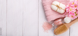 Pink Spa setting and health care items on white background. Space for text, flat lay