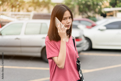 Woman using smartphone for the application on car blur background. Concepts for digital technology in everyday Life.