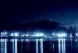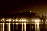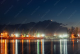 Industrial cranes and cargo ships in Varna port, Bulgaria at sunset