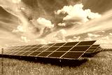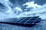 Solar panel on blue sky background. Green grass and cloudy sky. Alternative energy concept