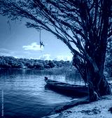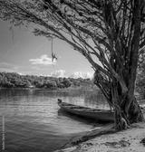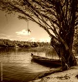 Flat river boat on shore of Rio Negro, Manaus, Brazil.CR2