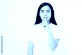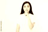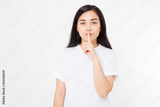 Shh hush sign. Young asian woman isolated on white background in blank summer t shirt. Copy space. Japanese girl