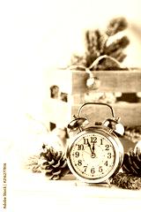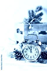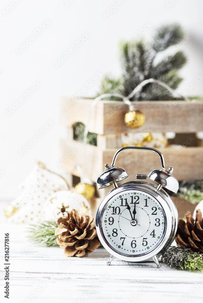 Christmas card with clock and christmas ornament, selective focus