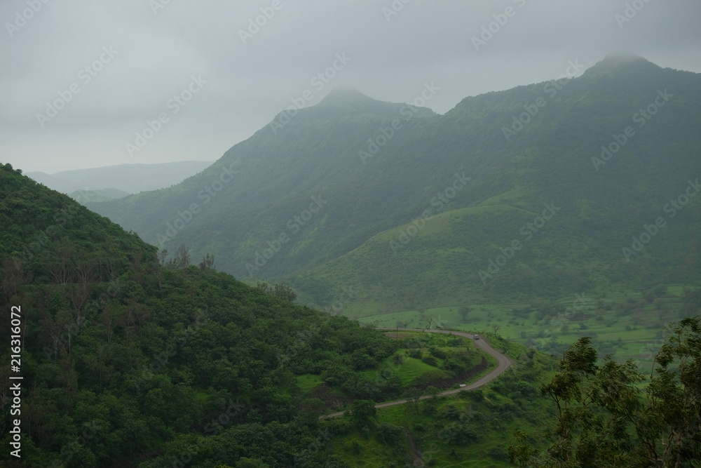 Lush green monsoon nature landscape mountains, hills, Purandar, Pune, Maharashtra, India