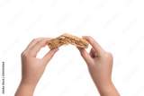 Broken Whole grain wheat biscuits breakfast cereal in hand