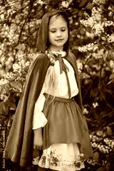 Smiling blond girl posing in a dress of little red riding hood near green trees