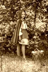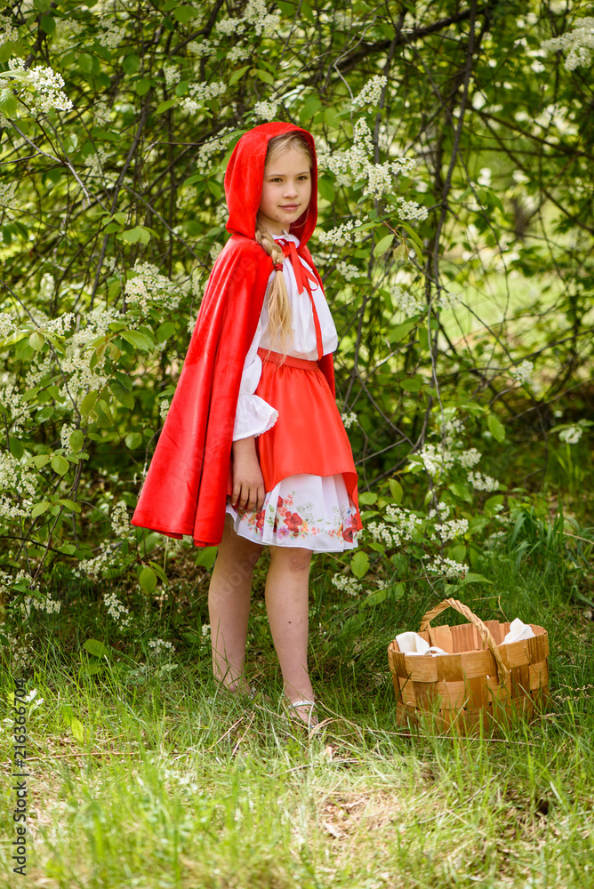 Smiling blond girl posing in a dress of little red riding hood near green trees