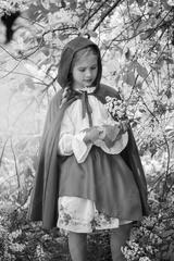 Smiling blond girl posing in a dress of little red riding hood near green trees